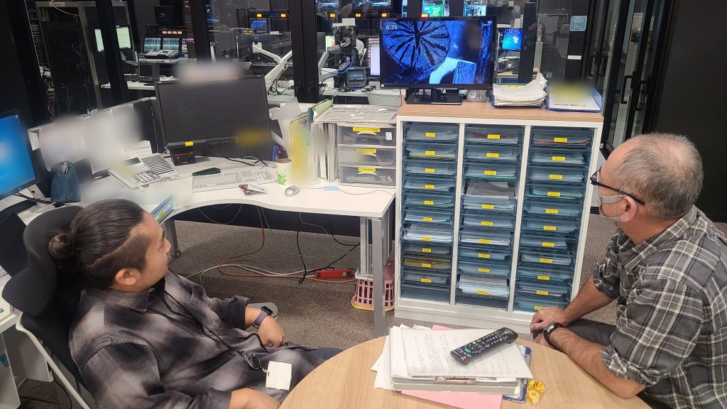 🎞️作品のオンエアを見守るカメラマンと先輩カメラマン。放送の瞬間、ちょっとだけ空気がピンとする。