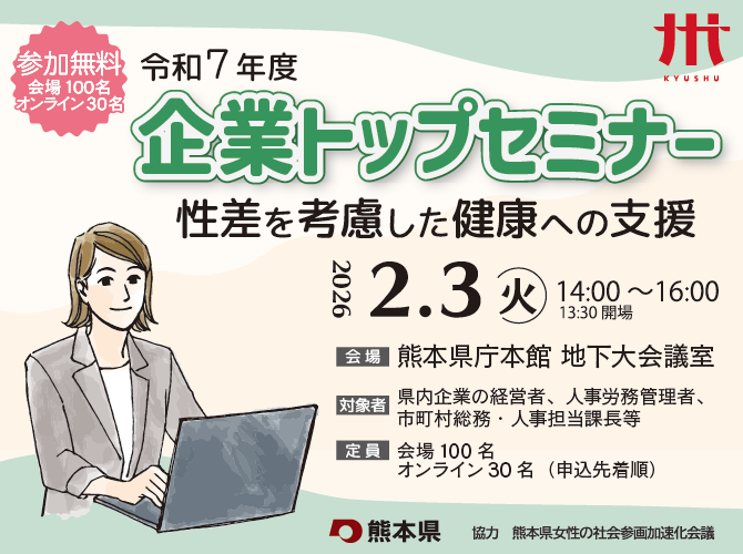 熊本県では、男女が働きやすい環境整備や企業の意思決定の場への女性の参画促進等の重要性を考える契機とするため、企業トップセミナーを開催します。