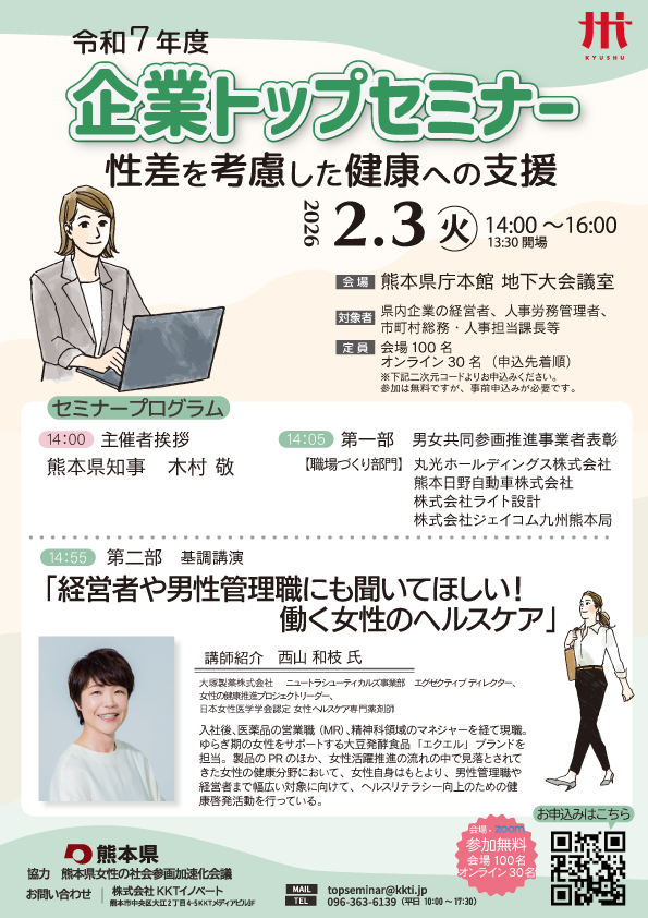熊本県では、男女が働きやすい環境整備や企業の意思決定の場への女性の参画促進等の重要性を考える契機とするため、企業トップセミナーを開催します。