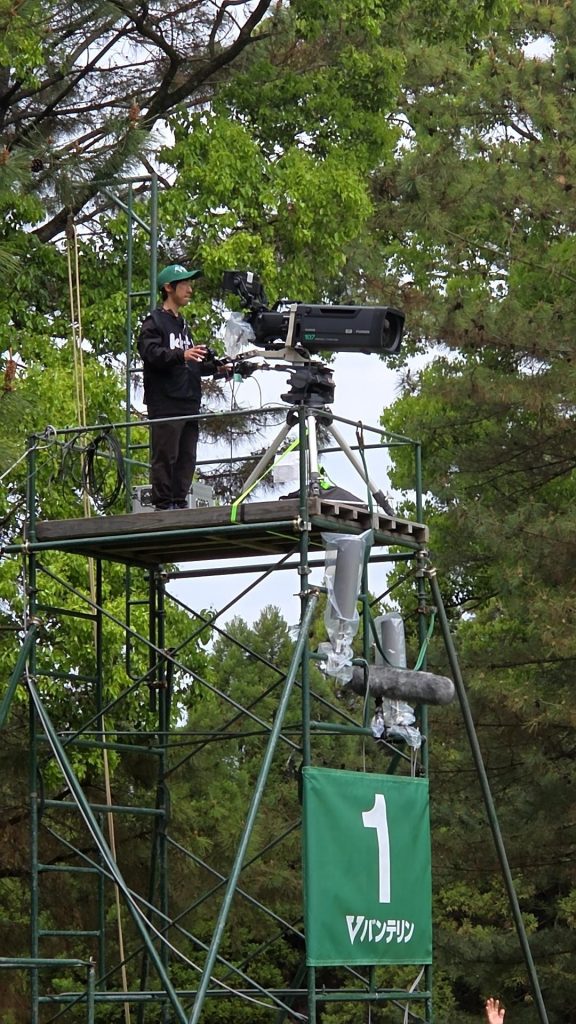 大会初日も、早朝から現場に入り、高所イントレに設置したカメラやコースサイドから、